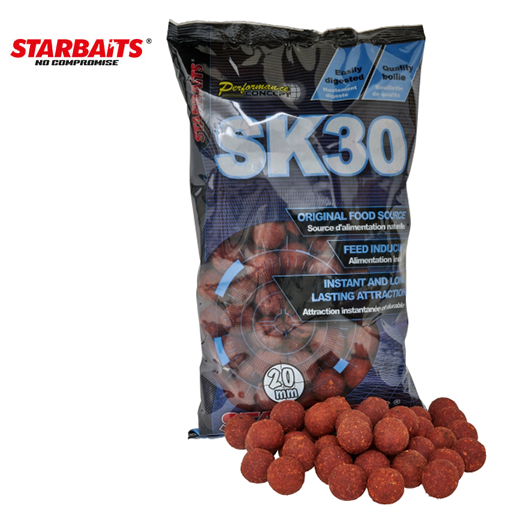 El "SK 30" tiene un perfil de aminoácidos y ácidos grasos para ser clasificado como un elemento esencial para la captura de grandes carpas. Estos boilies logran la estimulación de los componentes olfativos y gustativos que promueven el apetito de la carpa. Sus aceites esenciales y alta digestiiblidad provoca la adicción del pez en los cebados a largo plazo sin llegar a producir saturación.
