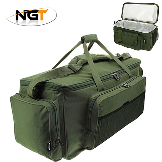 Una bolsa de transporte gigante de color verde oliva con un compartimento principal aislado y tres bolsillos externos con cremallera para guardar varios objetos. Las asas acolchadas y la correa acolchada y ajustable para el hombro se incluyen de serie, y está fabricada en poliéster 600D impermeabilizado con forro 210D.