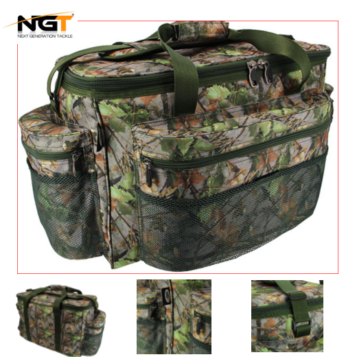 Un gran bolsa de color camuflaje para todos los pescadores, con un compartimento principal grande y 3 generosos bolsillos externos con cremallera y malla. Las asas acolchadas y la bandolera ajustable acolchada se incluyen como estándar y están hechas de poliéster 600D impermeabilizado con respaldo de PVC.