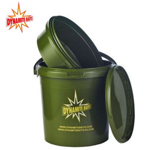 Cubo hermetico para cebo dynamite baits en color verdde, fabricado en plastico duro para una mayor duracion, tapa hermetica, lleva un separador interior en forma de bandeja asa con agarrador en plastico, capaidad