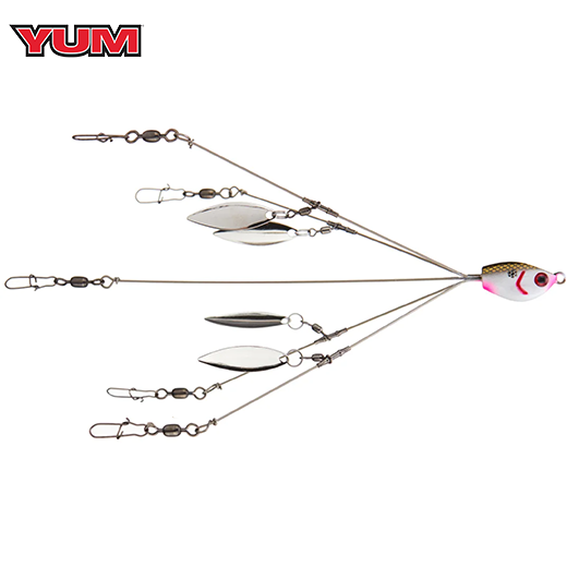 Las hojas willow ofrecen un mayor destello con una vibración limitada y son excelentes para condiciones de agua más clara. Perfecto para pescar basses suspendidos, así como otros depredadores que se alimentan de peces carnada, puedes montar el Yum Ultralight Flash Mob Jr. con una variedad de señuelos. Siempre es posible enganchar más de uno a la vez, así que agárrate fuerte.