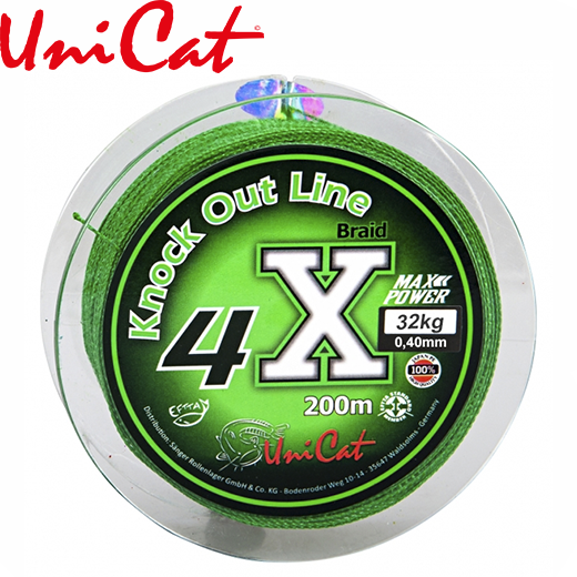 Estas líneas especiales para el Siluro trenzadas cumplen todos los requisitos de las líneas modernas de alto rendimiento. En términos de resistencia a la tracción y a la abrasión, la nueva línea Knock Out puntúa como ninguna otra. Incluso el de 0,40 mm tiene una capacidad de carga probada de 32 kg. Gracias a su fibras apretadas, el trenzado no absorbe el agua y se pueden realizar lances largos. El llamativo color fluorescente del trenzado permite saber dónde está el cebo, incluso con poca visibilidad. Unicat Knock Out está disponible en varios diámetros y longitudes.